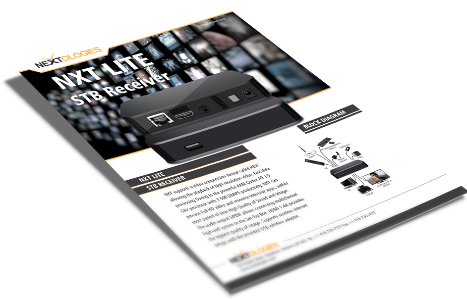 NXT LITE STB RECEIVER supports a video compression format called HEVC allowing the playback of high-resolution video. Fast data processing Owing to the powerful ARM Cortex A9 1.5 GHz processor with 3 500 DMIPS productivity, NXT LITE can process Full HD video and resource-intensive apps, within short period of time High Quality of Sound and Image: The audio output S/PDIF allows connecting multichannel high-end system to the Set-Top Box. HDMI 1.4A provides the highest quality of image. Supports wireless internet setups with the provided USB wireless adapter.